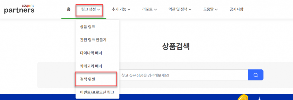 쿠팡파트너스로 이동하여 링크 생성 > 검색 위젯 으로 들어갑니다.