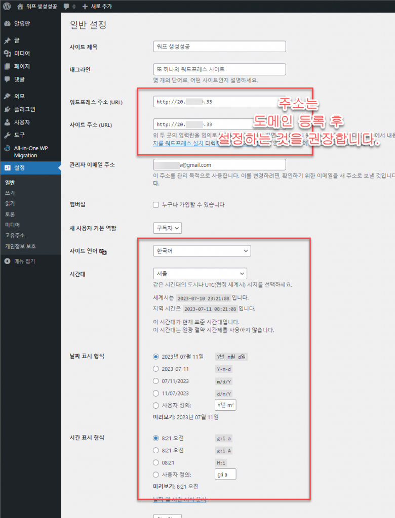 워드프레스 주소와 표시될 언어, 시간대와 시간표시 방법등 기본적인 설정들을 체크 합니다.