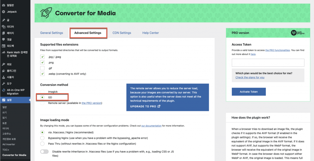 GD로 되어 있으면 이 후 업로드 되는 이미지들을 자동으로 WebP로 변환해 줍니다.