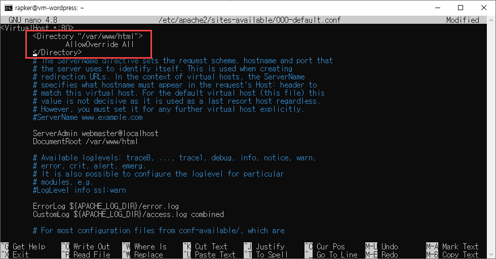 nano편집기로 apache2.conf 파일을 열고 아래 이미지 처럼 AllowOverride 값을 변경합니다.