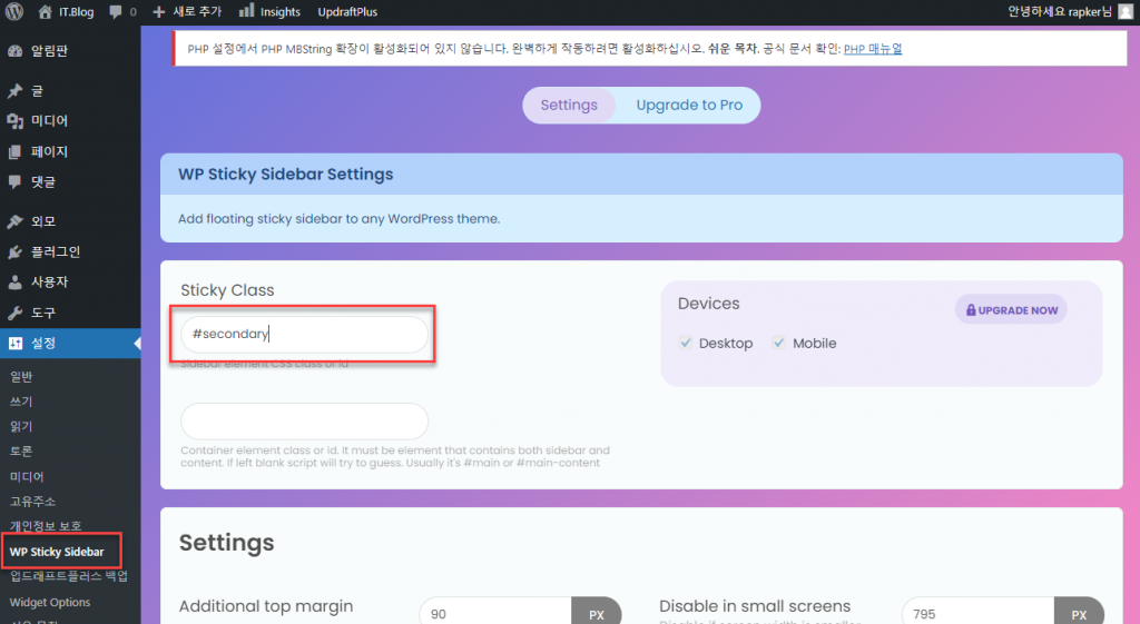 WP Sticky Sidebar 플러그인의 설정으로 이동하여 top margin을 조정합니다.